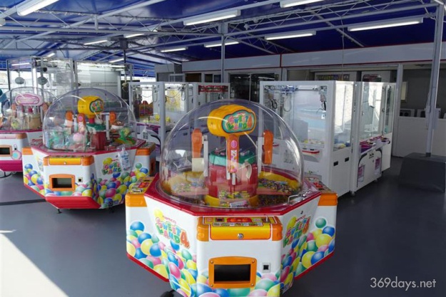 見るだけでも楽しい、最新の景品が並ぶゲームコーナー。飲み物の自動販売機・事務所もここにあります。