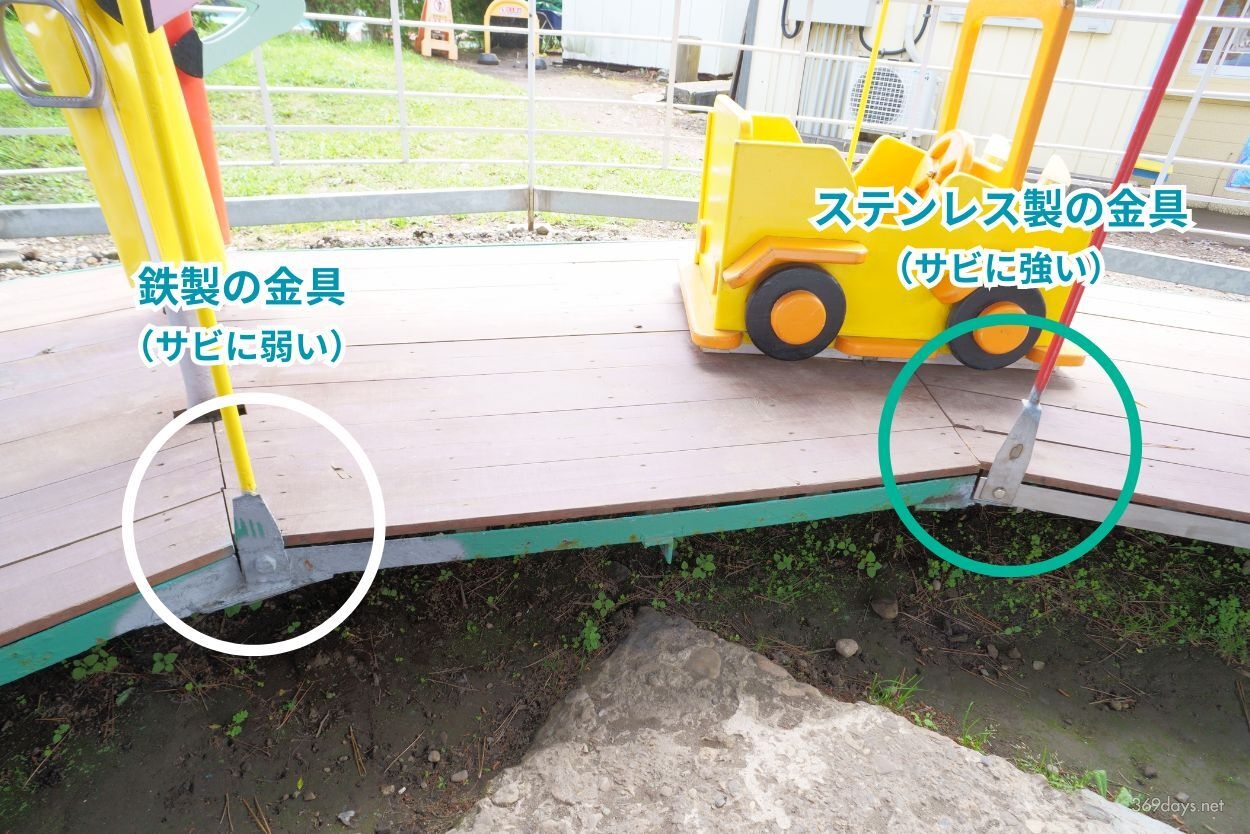 そこで、メリーゴーランドを長く動かしていくための工夫も始めています。床と柱を繋ぐ金具を見ていただくと、左側と右側で素材が違っているんです。左側は従来の鉄製の金具でサビにそれほど強くないのですが、右側はステンレス製でサビに強い素材になっています。費用はステンレス製の方が高いのですが、少しずつ交換していってメリーゴーランドを長く動かしていきたいと思っています。