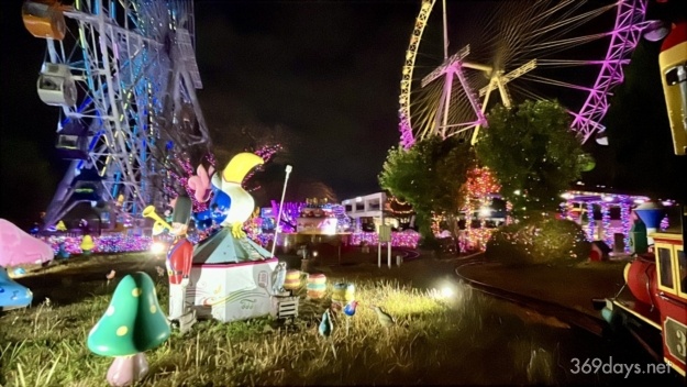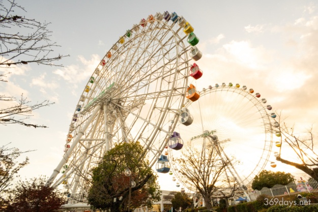 ツイン観覧車の光景は、園内の様々な場所から撮影することができます。