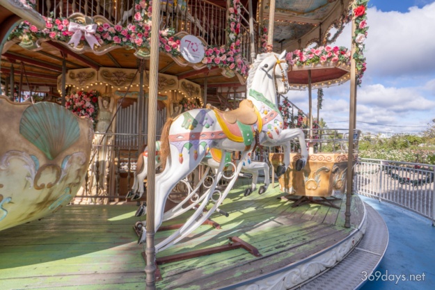 イタリア製の2階建メリーゴーラウンドに、11月30日(日)までの期間限定でバラの装飾が施されています。