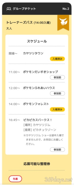 今回はショップ、ふれあいハウス、ピカピカスパークス!すべての整理券を取ることができました。アプリには1日のスケジュールがこのように表示されます!