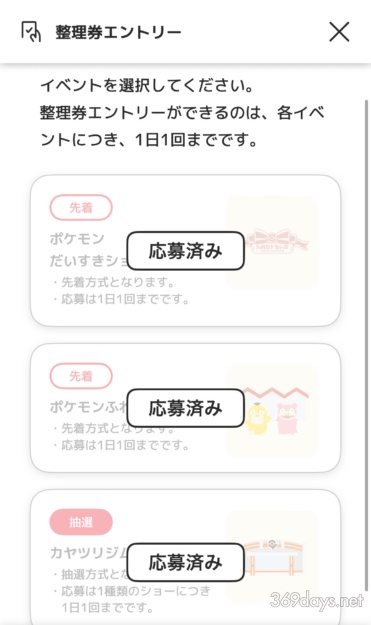 整理券をすべて応募するとこのような画面になります。
